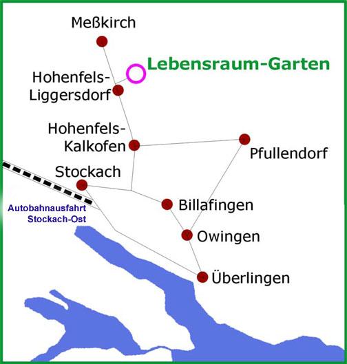 In der Ortsmitte von Hohenfels-Liggersdorf (Kirche) auf der „Haupstraße“ nach Norden in Richtung: